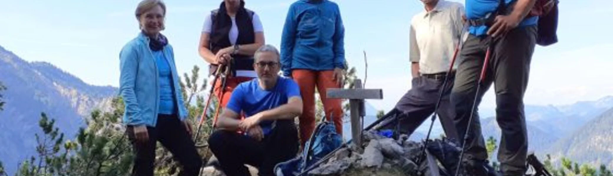 Gestartet wurde am Lödensee bei Ruhpolding. Bei herrlichem Herbstwetter wanderten Christa A, Christine und Christian B, Stefan E und Otto R mit Marianne und Werner K durch lichten Wald und auf schmalen Pfaden, die Trittsicherheit erforderten, zum Gipfel, wo alle das wackelige Gipfelkreuz (ca. 50cm hoch) bestaunten.